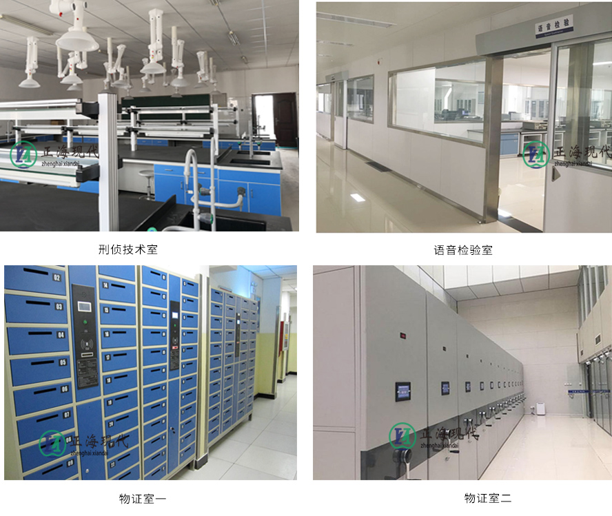 痕跡檢驗室(痕跡物理檢驗室、痕跡化學檢驗室、足跡檢驗室、工具痕跡檢驗室、顯微對比室)、法醫檢驗室、電子物證室、物證保管室、文字檢測室、影像室、信息研判室,器材室等。